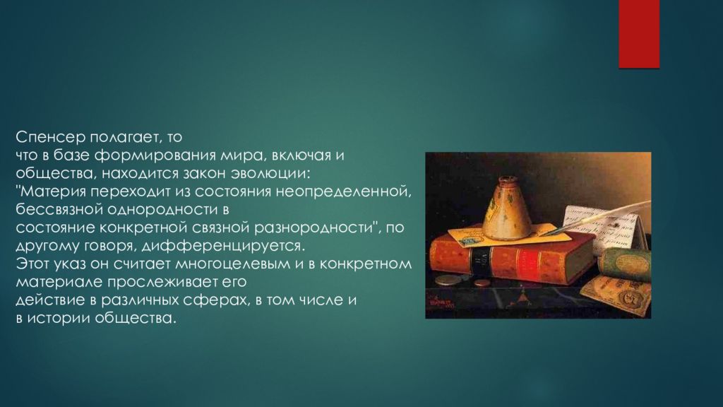 Спенсер полагает, то что в базе формирования мира, включая и общества, находится закон эволюции: "Материя переходит из состояния неопределенной, бессвязной однородности в состояние конкретной связной разнородности", по другому говоря, дифференцируется. Этот указ он считает многоцелевым и в конкретном материале прослеживает его действие в различных сферах, в том числе и в истории общества.