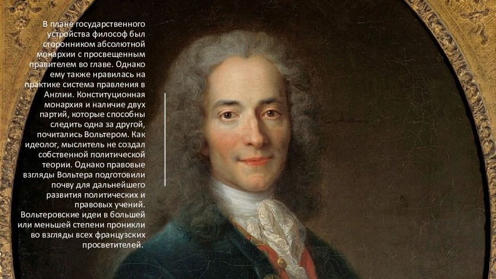 Вольтер был приверженцем просвещенного абсолютизма. До конца жизни он был монархистом. По его мнению, монарх должен опираться на просвещенную часть общества в лице интеллигенции и философов.