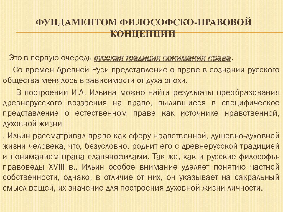 Это в первую очередь русская традиция понимания права. Со времен Древней Руси представление о праве в сознании русского общества менялось в зависимости от духа эпохи. В построении И.А. Ильина можно найти результаты преобразования древнерусского воззрения на право, вылившиеся в специфическое представление о естественном праве как источнике нравственной, духовной жизни . Ильин рассматривал право как сферу нравственной, душевно-духовной жизни человека, что, безусловно, роднит его с древнерусской традицией и пониманием права славянофилами. Так же, как и русские философы-правоведы XVIII в., Ильин особое внимание уделяет понятию частной собственности, однако, в отличие от них, он указывает на сакральный смысл вещей, их значение для построения духовной жизни личности.