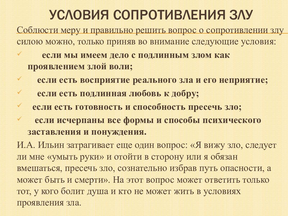 Соблюсти меру и правильно решить вопрос о сопротивлении злу силою можно, только приняв во внимание следующие условия: если мы имеем дело с подлинным злом как проявлением злой воли; если есть восприятие реального зла и его неприятие; если есть подлинная любовь к добру ; если есть готовность и способность пресечь зло; если исчерпаны все формы и способы психического заставления и понуждения. И.А. Ильин затрагивает еще один вопрос: «Я вижу зло, следует ли мне «умыть руки» и отойти в сторону или я обязан вмешаться, пресечь зло, сознательно избрав путь опасности, а может быть и смерти». На этот вопрос может ответить только тот, у кого болит душа и кто не может жить в условиях проявления зла.
