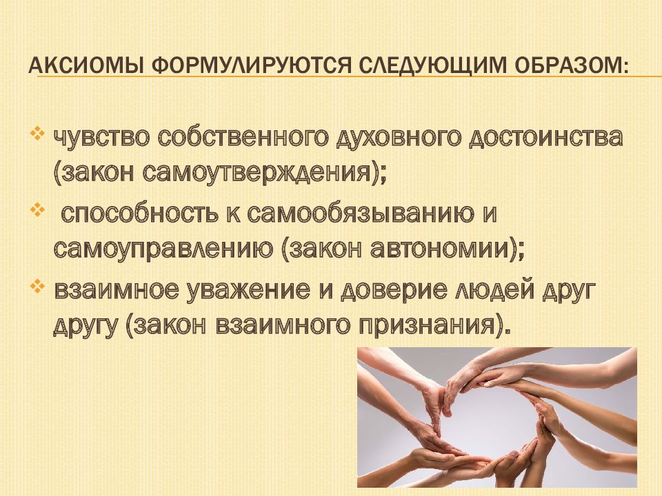 чувство собственного духовного достоинства (закон самоутверждения ); способность к самообязыванию и самоуправлению (закон автономии); взаимное уважение и доверие людей друг другу (закон взаимного признания).