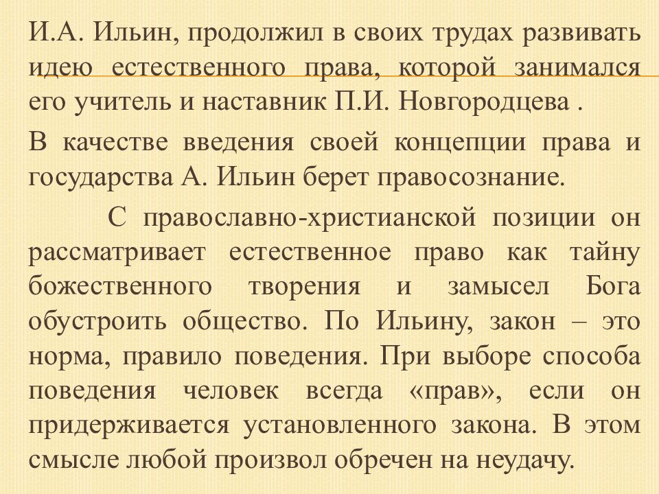 И.А. Ильин, продолжил в своих трудах развивать идею естественного права, которой занимался его учитель и наставник П.И. Новгородцева. В качестве введения своей концепции права и государства А. Ильин берет правосознание. С православно -христианской позиции он рассматривает естественное право как тайну божественного творения и замысел Бога обустроить общество. По Ильину, закон – это норма, правило поведения. При выборе способа поведения человек всегда «прав», если он придерживается установленного закона. В этом смысле любой произвол обречен на неудачу.