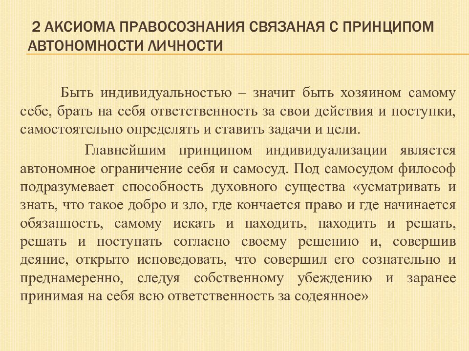 Быть индивидуальностью – значит быть хозяином самому себе, брать на себя ответственность за свои действия и поступки, самостоятельно определять и ставить задачи и цели. Главнейшим принципом индивидуализации является автономное ограничение себя и самосуд. Под самосудом философ подразумевает способность духовного существа «усматривать и знать, что такое добро и зло, где кончается право и где начинается обязанность, самому искать и находить, находить и решать, решать и поступать согласно своему решению и, совершив деяние, открыто исповедовать, что совершил его сознательно и преднамеренно, следуя собственному убеждению и заранее принимая на себя всю ответственность за содеянное»