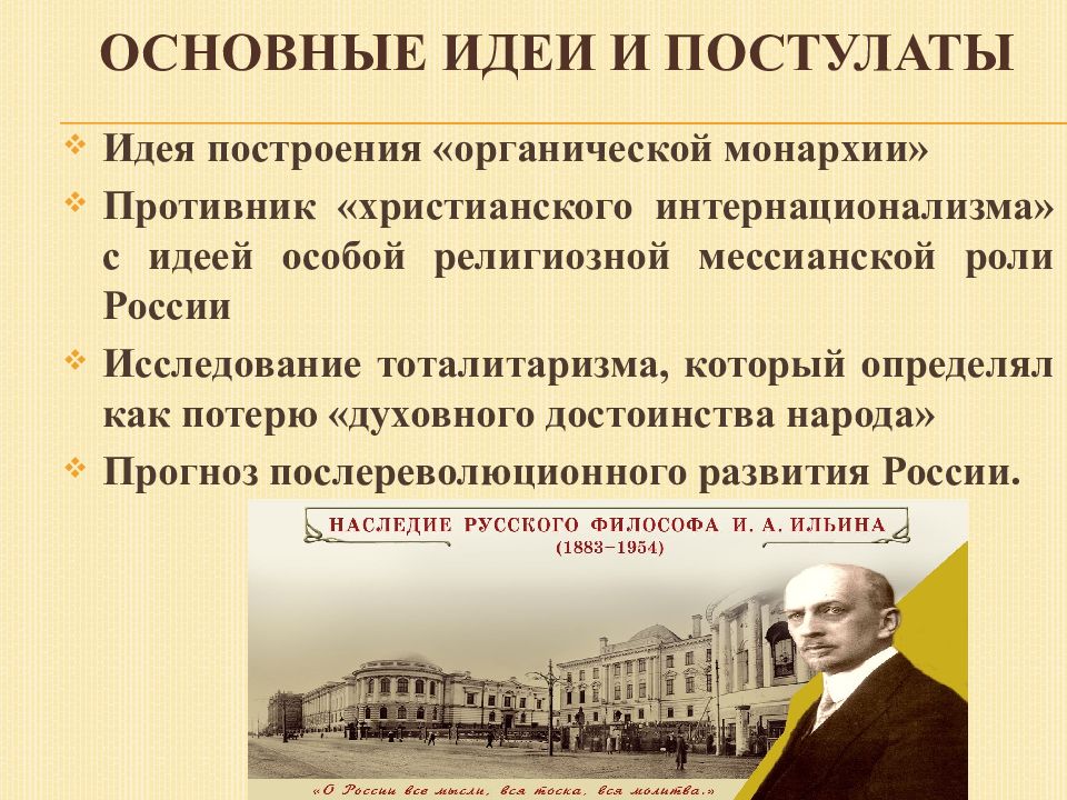 Идея построения «органической монархии» Противник «христианского интернационализма» с идеей особой религиозной мессианской роли России Исследование тоталитаризма, который определял как потерю «духовного достоинства народа» Прогноз послереволюционного развития России.