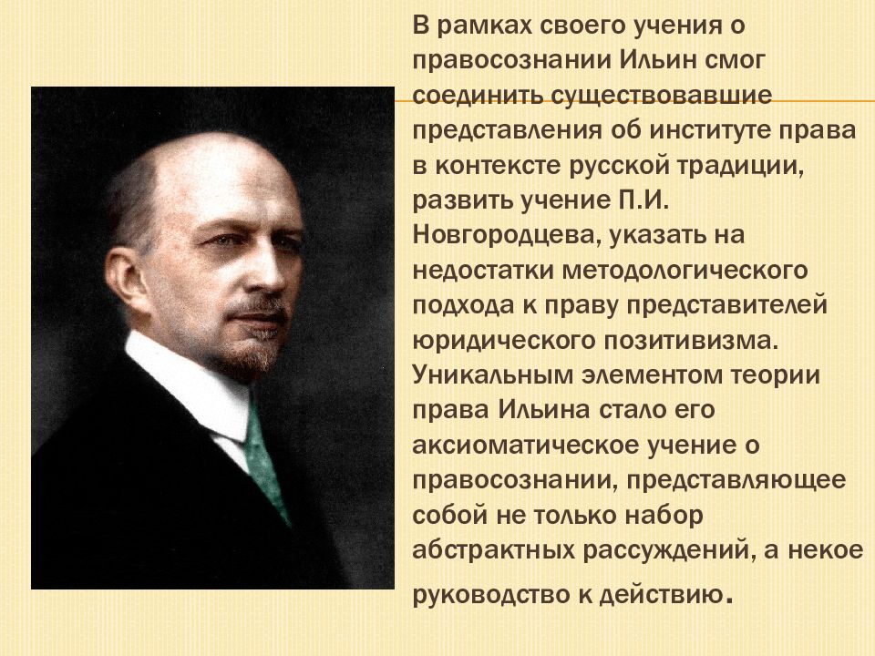 В рамках своего учения о правосознании Ильин смог соединить существовавшие представления об институте права в контексте русской традиции, развить учение П.И. Новгородцева, указать на недостатки методологического подхода к праву представителей юридического позитивизма. Уникальным элементом теории права Ильина стало его аксиоматическое учение о правосознании, представляющее собой не только набор абстрактных рассуждений, а некое руководство к действию.