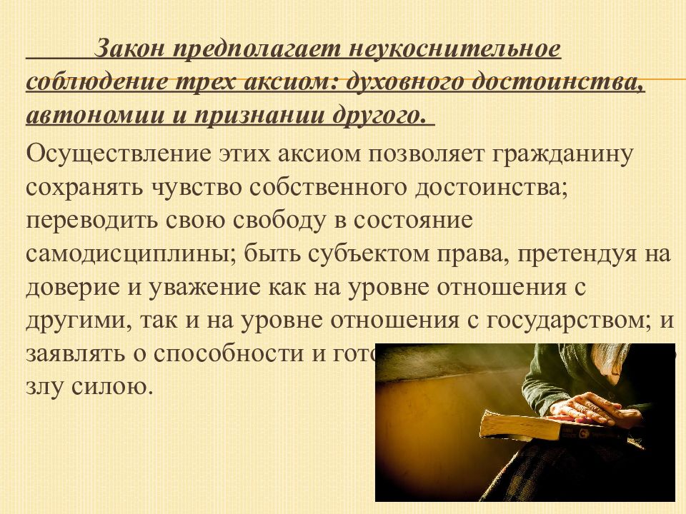 Закон предполагает неукоснительное соблюдение трех аксиом: духовного достоинства, автономии и признании другого. Осуществление этих аксиом позволяет гражданину сохранять чувство собственного достоинства; переводить свою свободу в состояние самодисциплины; быть субъектом права, претендуя на доверие и уважение как на уровне отношения с другими, так и на уровне отношения с государством; и заявлять о способности и готовности к сопротивлению злу силою.