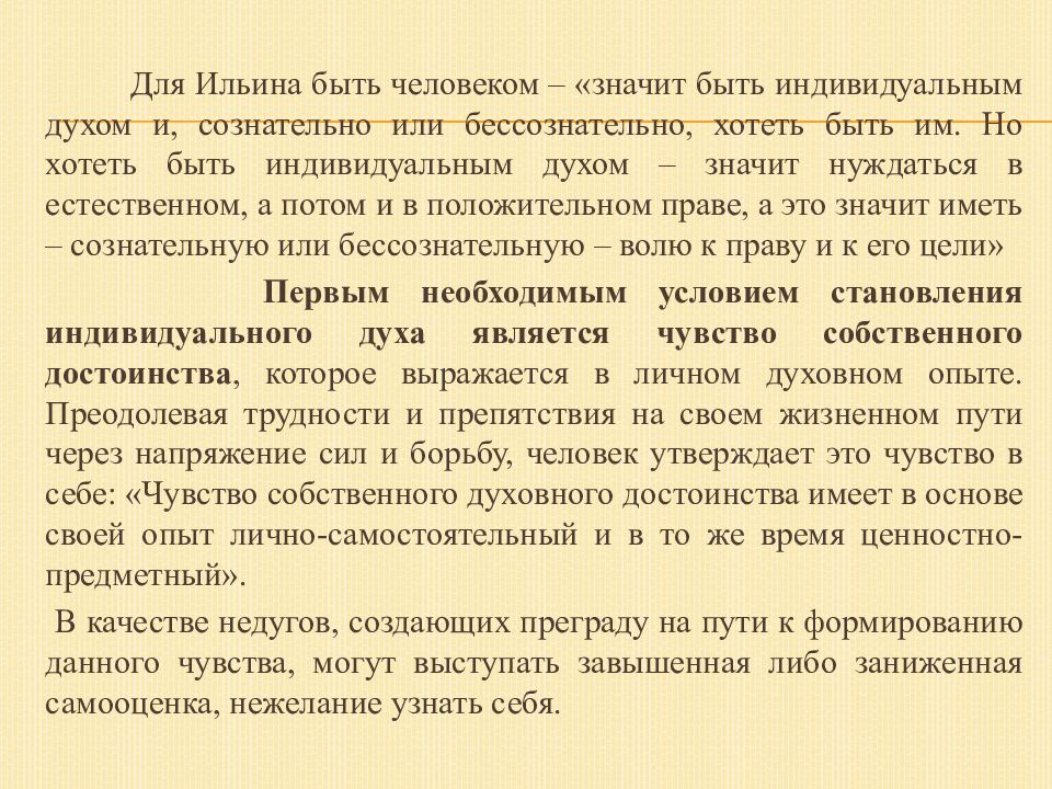 Для Ильина быть человеком – «значит быть индивидуальным духом и, сознательно или бессознательно, хотеть быть им. Но хотеть быть индивидуальным духом – значит нуждаться в естественном, а потом и в положительном праве, а это значит иметь – сознательную или бессознательную – волю к праву и к его цели » Первым необходимым условием становления индивидуального духа является чувство собственного достоинства, которое выражается в личном духовном опыте. Преодолевая трудности и препятствия на своем жизненном пути через напряжение сил и борьбу, человек утверждает это чувство в себе: «Чувство собственного духовного достоинства имеет в основе своей опыт лично-самостоятельный и в то же время ценностно-предметный ». В качестве недугов, создающих преграду на пути к формированию данного чувства, могут выступать завышенная либо заниженная самооценка, нежелание узнать себя.