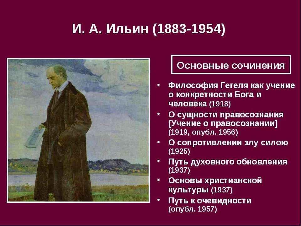 Русский философ, профессор Московского университета, был выслан в 1922 г. из России вместе с другими философами, долгое время работал в Религиозной философской академии в Берлине. Взгляды Ильина в значительной степени сложились под влиянием философии Гегеля. Ильин полагал, что философия — это опытная наука. Однако опыт в его понимании — это, прежде всего умозрение, созерцание предмета.
