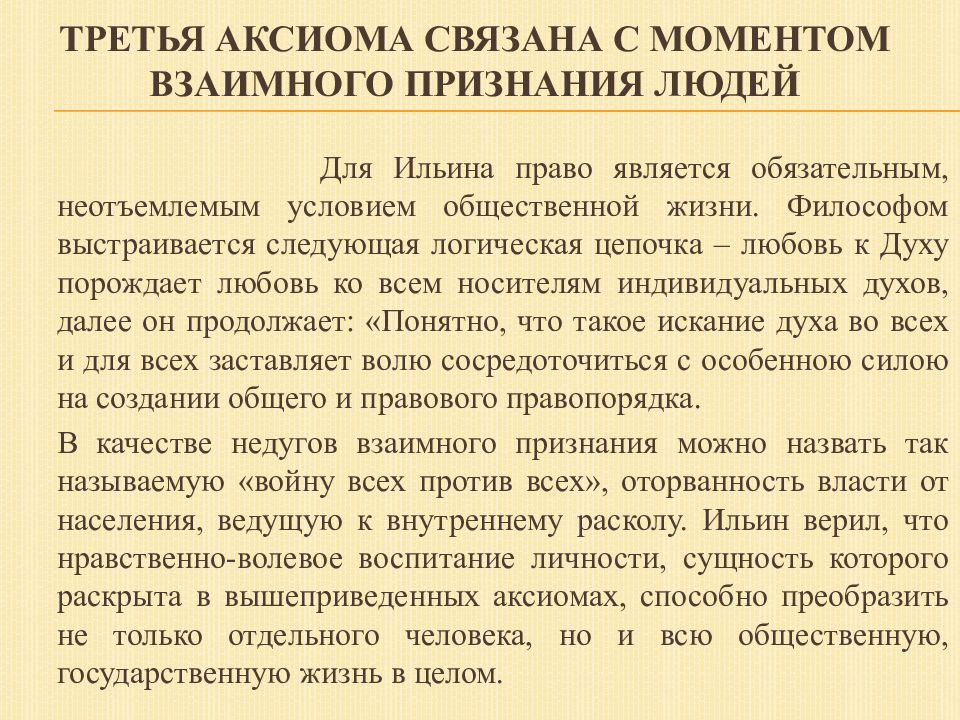 Для Ильина право является обязательным, неотъемлемым условием общественной жизни. Философом выстраивается следующая логическая цепочка – любовь к Духу порождает любовь ко всем носителям индивидуальных духов, далее он продолжает: «Понятно, что такое искание духа во всех и для всех заставляет волю сосредоточиться с особенною силою на создании общего и правового правопорядка. В качестве недугов взаимного признания можно назвать так называемую «войну всех против всех», оторванность власти от населения, ведущую к внутреннему расколу. Ильин верил, что нравственно-волевое воспитание личности, сущность которого раскрыта в вышеприведенных аксиомах, способно преобразить не только отдельного человека, но и всю общественную, государственную жизнь в целом.