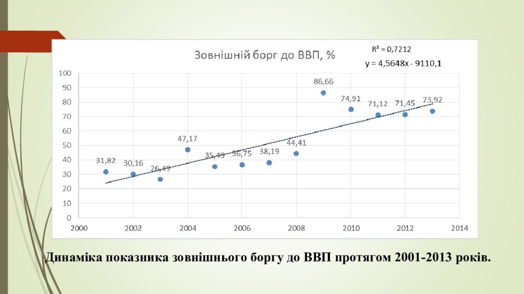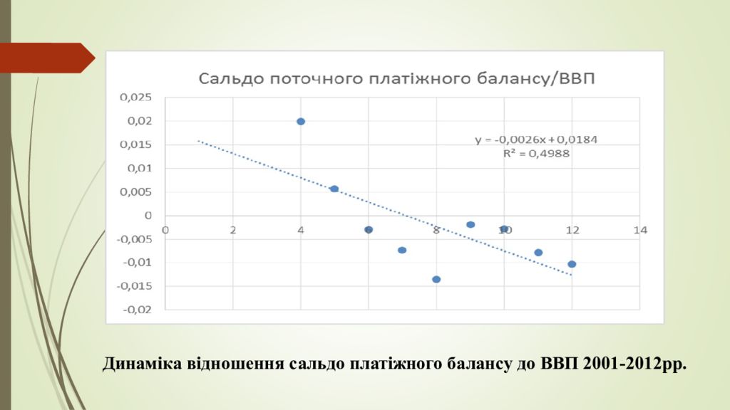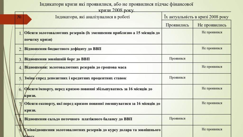 № Індикатори, які аналізувалися в роботі Їх актуальність в кризі 2008 року Проявились Не проявились 1. Обсяги золотовалютних резервів (їх зменшення приблизно а 15 місяців до початку кризи) Не проявився 2. Відношення бюджетного дефіциту до ВВП Не проявився 3. Відношення зовнішній борг до ВВП Проявився 4. Відношення: золотовалютних резервів до грошова маса Не проявився 5. Зміна спред депозитних і кредитних процентних ставок Проявився 6. Обсяги імпорту, перед кризою повинні збільшуватись за 16 місяців до кризи. Не проявився 7. Обсяги експорту, які перед кризою повинні зменшуватися за 16 місяців до кризи. Не проявився 8. Відношення сальдо поточного платіжного балансу до ВВП Проявився 9. Співвідношення золотовалютних резервів до курсу долара та зовнішнього боргу Не проявився Індикатори кризи які проявилися, або не проявилися підчас фінансової кризи 2008 року.