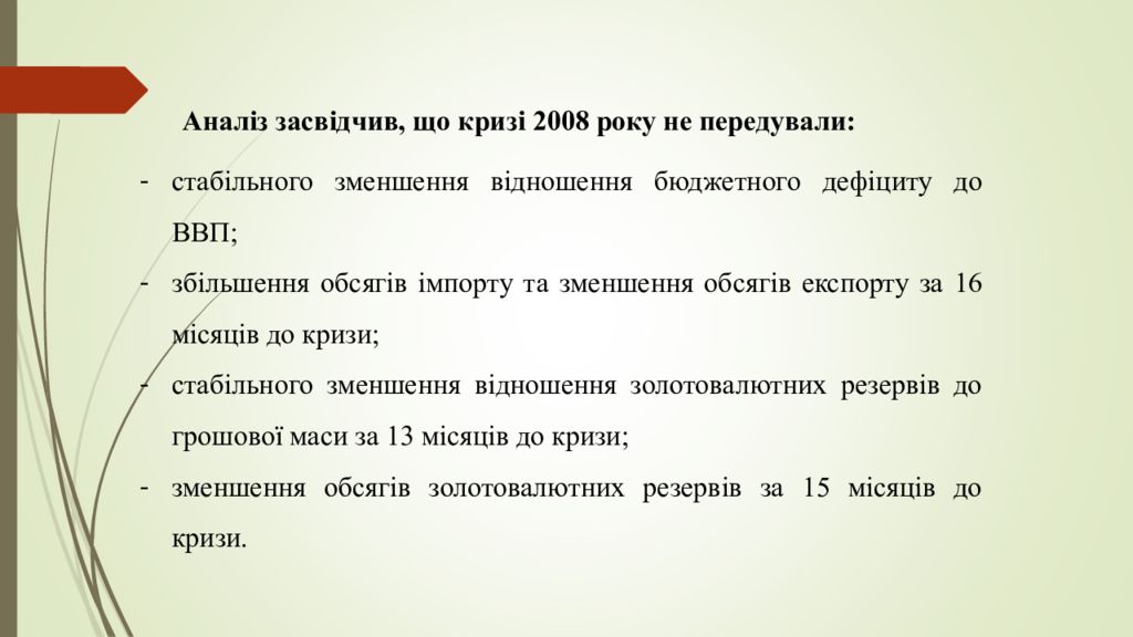 Аналіз засвідчив, що кризі 2008 року не передували: стабільного зменшення відношення бюджетного дефіциту до ВВП; збільшення обсягів імпорту та зменшення обсягів експорту за 16 місяців до кризи ; стабільного зменшення відношення золотовалютних резервів до грошової маси за 13 місяців до кризи ; зменшення обсягів золотовалютних резервів за 15 місяців до кризи.