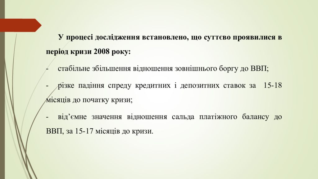 У процесі дослідження встановлено, що суттєво проявилися в період кризи 2008 року: - стабільне збільшення відношення зовнішнього боргу до ВВП; - різке падіння спреду кредитних і депозитних ставок за 15-18 місяців до початку кризи; - від’ємне значення відношення сальда платіжного балансу до ВВП, за 15-17 місяців до кризи.