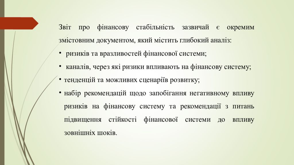 Звіт про фінансову стабільність зазвичай є окремим змістовним документом, який містить глибокий аналіз: ризиків та вразливостей фінансової системи; каналів, через які ризики впливають на фінансову систему; тенденцій та можливих сценаріїв розвитку; набір рекомендацій щодо запобігання негативному впливу ризиків на фінансову систему та рекомендації з питань підвищення стійкості фінансової системи до впливу зовнішніх шоків.