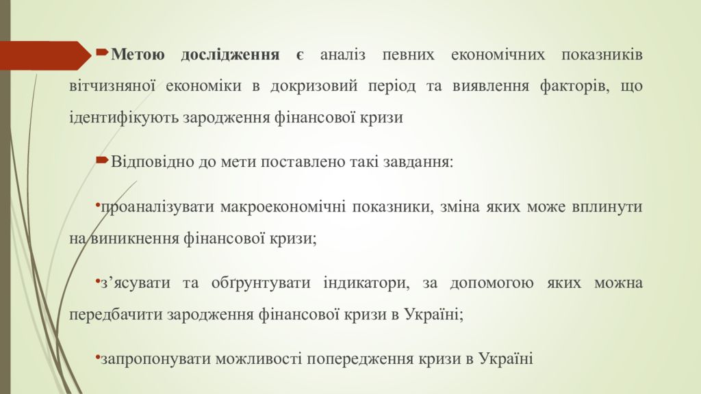 Метою дослідження є аналіз певних економічних показників вітчизняної економіки в докризовий період та виявлення факторів, що ідентифікують зародження фінансової кризи Відповідно до мети поставлено такі завдання: проаналізувати макроекономічні показники, зміна яких може вплинути на виникнення фінансової кризи; з’ясувати та обґрунтувати індикатори, за допомогою яких можна передбачити зародження фінансової кризи в Україні; запропонувати можливості попередження кризи в Україні