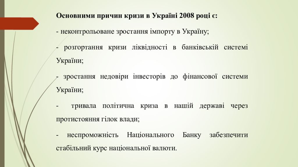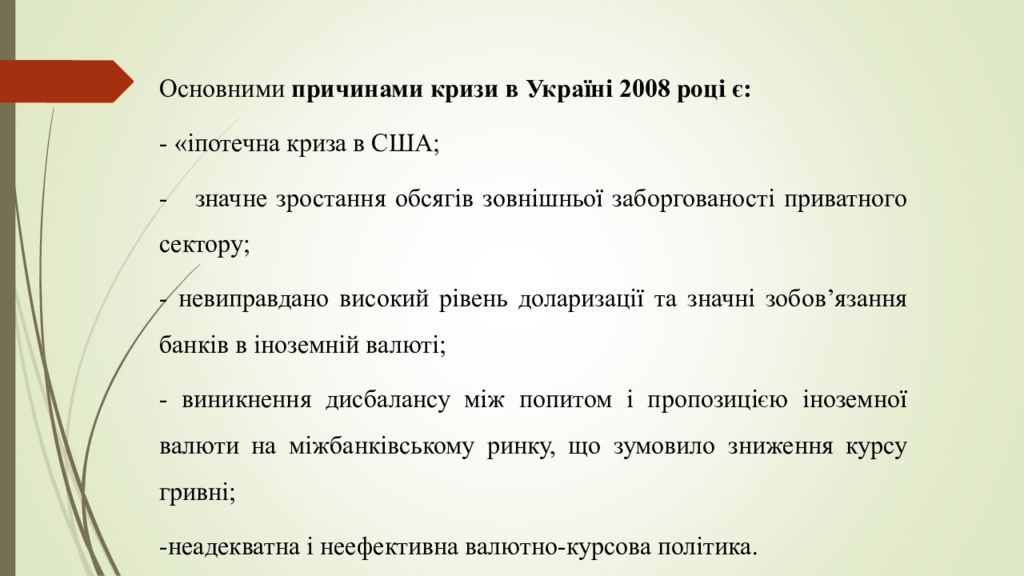 Основними причинами кризи в Україні 2008 році є: - «іпотечна криза в США; - значне зростання обсягів зовнішньої заборгованості приватного сектору; - невиправдано високий рівень доларизації та значні зобов’язання банків в іноземній валюті; - виникнення дисбалансу між попитом і пропозицією іноземної валюти на міжбанківському ринку, що зумовило зниження курсу гривні; -неадекватна і неефективна валютно-курсова політика.