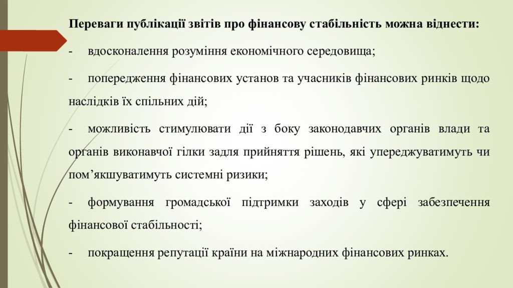 Переваги публікації звітів про фінансову стабільність можна віднести: - вдосконалення розуміння економічного середовища; - попередження фінансових установ та учасників фінансових ринків щодо наслідків їх спільних дій; - можливість стимулювати дії з боку законодавчих органів влади та органів виконавчої гілки задля прийняття рішень, які упереджуватимуть чи пом’якшуватимуть системні ризики; - формування громадської підтримки заходів у сфері забезпечення фінансової стабільності; - покращення репутації країни на міжнародних фінансових ринках.