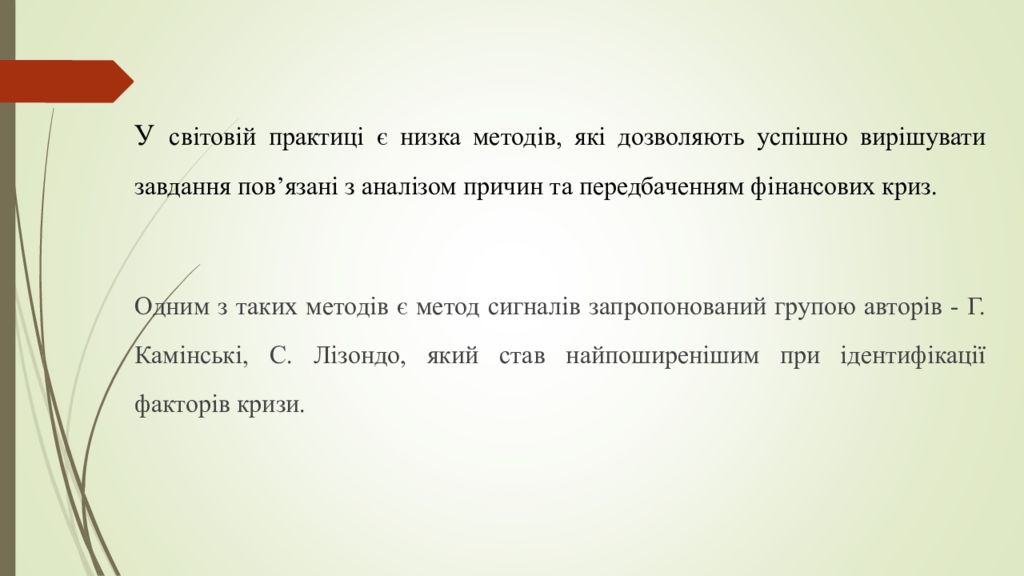 У світовій практиці є низка методів, які дозволяють успішно вирішувати завдання пов’язані з аналізом причин та передбаченням фінансових криз. Одним з таких методів є метод сигналів запропонований групою авторів - Г. Камінські, С. Лізондо, який став найпоширенішим при ідентифікації факторів кризи.