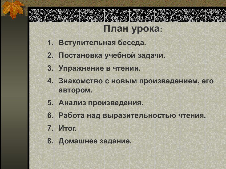 План урока : Вступительная беседа. Постановка учебной задачи. Упражнение в чтении. Знакомство с новым произведением, его автором. Анализ произведения. Работа над выразительностью чтения. Итог. Домашнее задание.