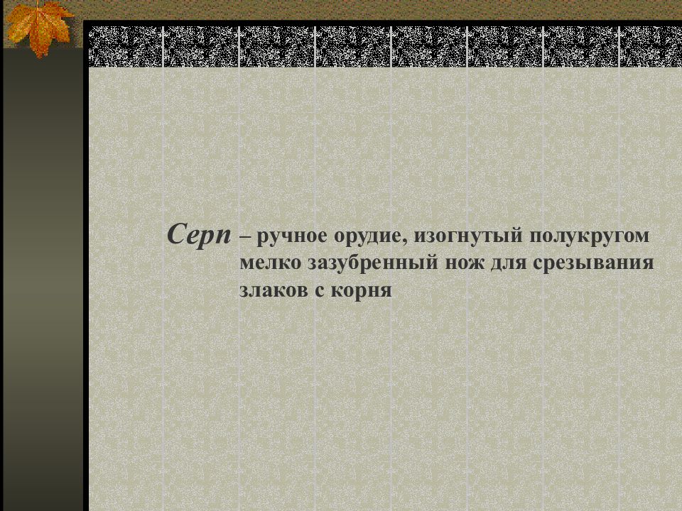 – ручное орудие, изогнутый полукругом мелко зазубренный нож для срезывания злаков с корня Серп