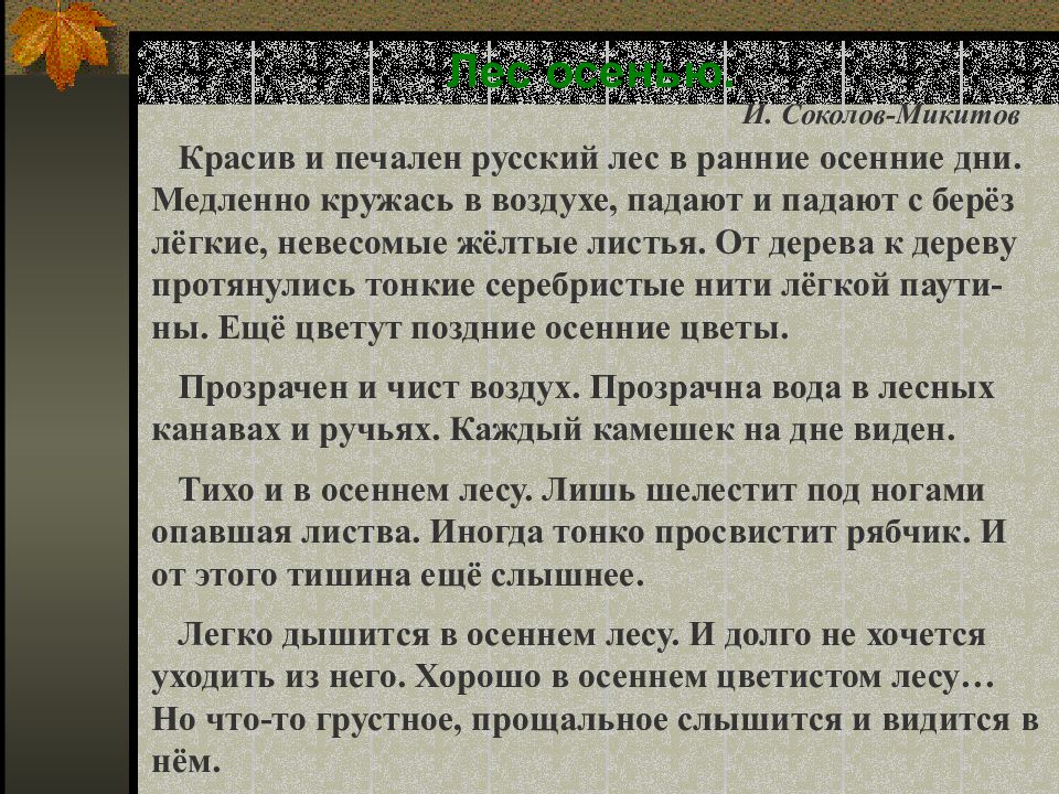 Красив и печален русский лес в ранние осенние дни. Медленно кружась в воздухе, падают и падают с берёз лёгкие, невесомые жёлтые листья. От дерева к дереву протянулись тонкие серебристые нити лёгкой паути-ны. Ещё цветут поздние осенние цветы. Прозрачен и чист воздух. Прозрачна вода в лесных канавах и ручьях. Каждый камешек на дне виден. Тихо и в осеннем лесу. Лишь шелестит под ногами опавшая листва. Иногда тонко просвистит рябчик. И от этого тишина ещё слышнее. Легко дышится в осеннем лесу. И долго не хочется уходить из него. Хорошо в осеннем цветистом лесу… Но что-то грустное, прощальное слышится и видится в нём. Лес осенью. И. Соколов-Микитов