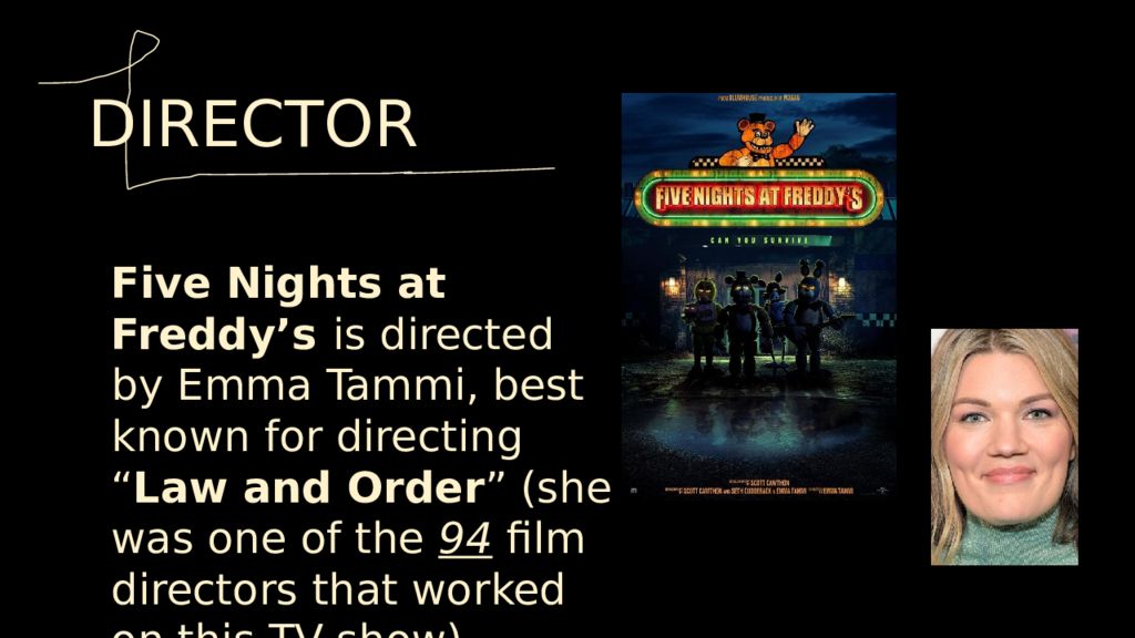 Five Nights at Freddy’s is directed by Emma Tammi, best known for directing “ Law and Order ” (she was one of the 94 film directors that worked on this TV-show). DIRECTOR
