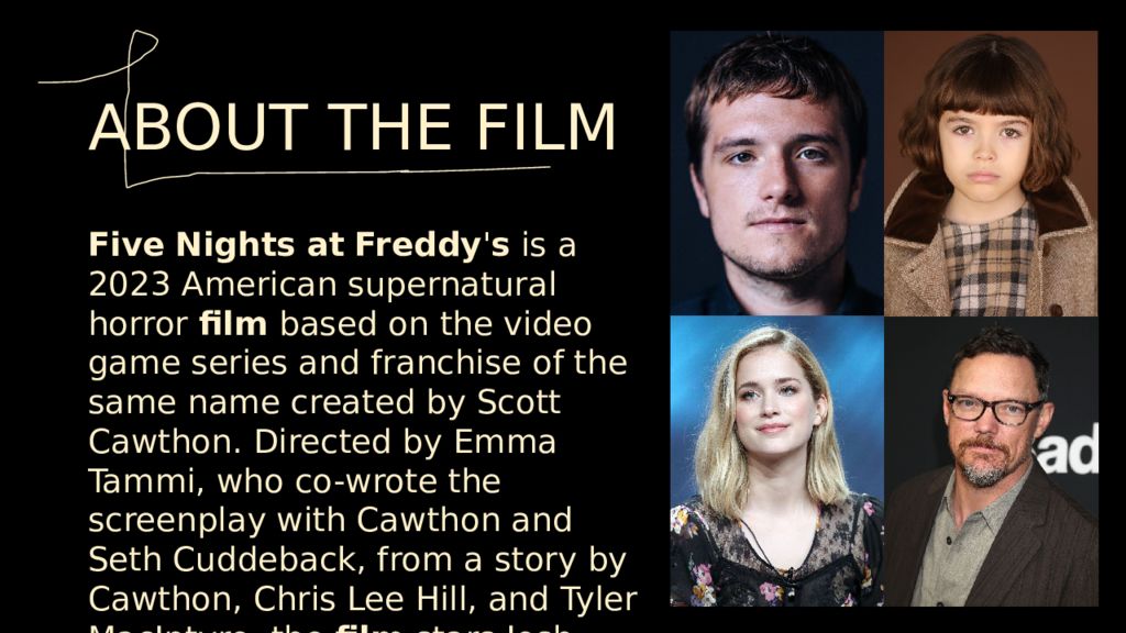 ABOUT THE FILM Five Nights at Freddy ' s is a 2023 American supernatural horror film based on the video game series and franchise of the same name created by Scott Cawthon. Directed by Emma Tammi, who co-wrote the screenplay with Cawthon and Seth Cuddeback, from a story by Cawthon, Chris Lee Hill, and Tyler MacIntyre, the film stars Josh Hutcherson, Piper Rubio, Elizabeth Lail, and Matthew Lillard.
