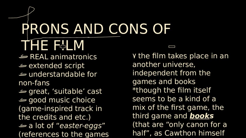 PRONS AND CONS OF THE FILM ڪ REAL animatronics ڪ extended script ڪ understandable for non-fans ڪ great, ‘suitable’ cast ڪ good music choice (game-inspired track in the credits and etc.) ڪ a lot of “ easter-eggs ” (references to the games and etc.) ۷ the film takes place in an another universe, independent from the games and books * though the film itself seems to be a kind of a mix of the first game, the third game and book s (that are “only canon for a half”, as Cawthon himself said) ۷ questionable genre
