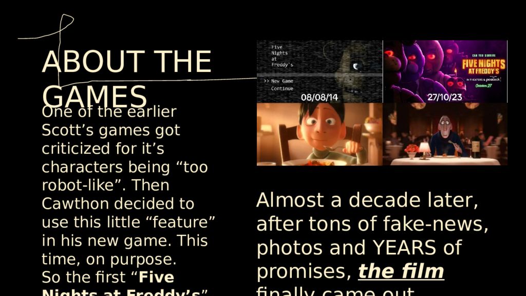 ABOUT THE GAMES One of the earlier Scott’s games got criticized for it’s characters being “too robot-like”. Then Cawthon decided to use this little “feature” in his new game. This time, on purpose. So the first “ Five Nights at Freddy’s ” game came out in 2014 and, unexpectedly, received a lot of admiration and good reviews. Almost a decade later, after tons of fake-news, photos and YEARS of promises, the film finally came out.