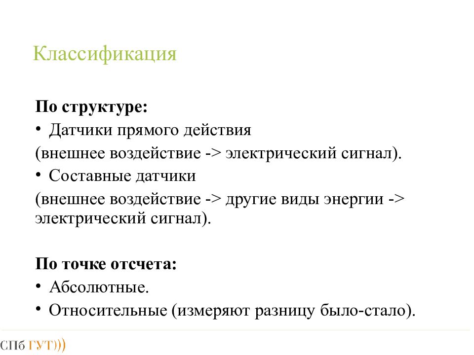 По структуре: Датчики прямого действия (внешнее воздействие -> электрический сигнал). Составные датчики (внешнее воздействие -> другие виды энергии -> электрический сигнал). По точке отсчета: Абсолютные. Относительные (измеряют разницу было-стало).