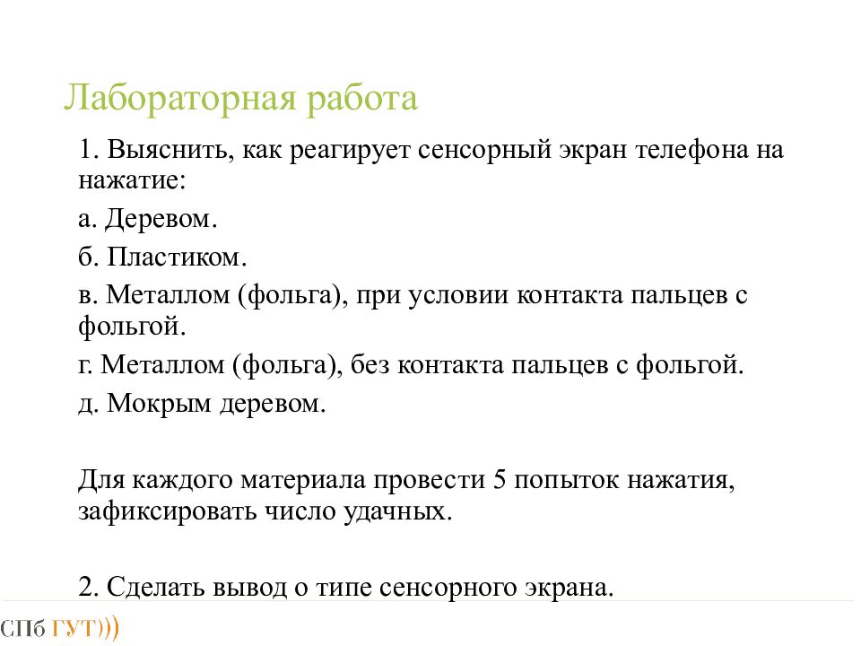 1. Выяснить, как реагирует сенсорный экран телефона на нажатие: а. Деревом. б. Пластиком. в. Металлом (фольга), при условии контакта пальцев с фольгой. г. Металлом (фольга), без контакта пальцев с фольгой. д. Мокрым деревом. Для каждого материала провести 5 попыток нажатия, зафиксировать число удачных. 2. Сделать вывод о типе сенсорного экрана.
