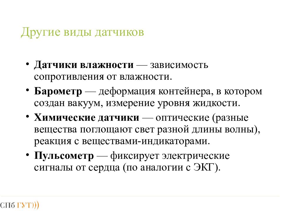 Датчики влажности — зависимость сопротивления от влажности. Барометр — деформация контейнера, в котором создан вакуум, измерение уровня жидкости. Химические датчики — оптические (разные вещества поглощают свет разной длины волны), реакция с веществами-индикаторами. Пульсометр — фиксирует электрические сигналы от сердца (по аналогии с ЭКГ).