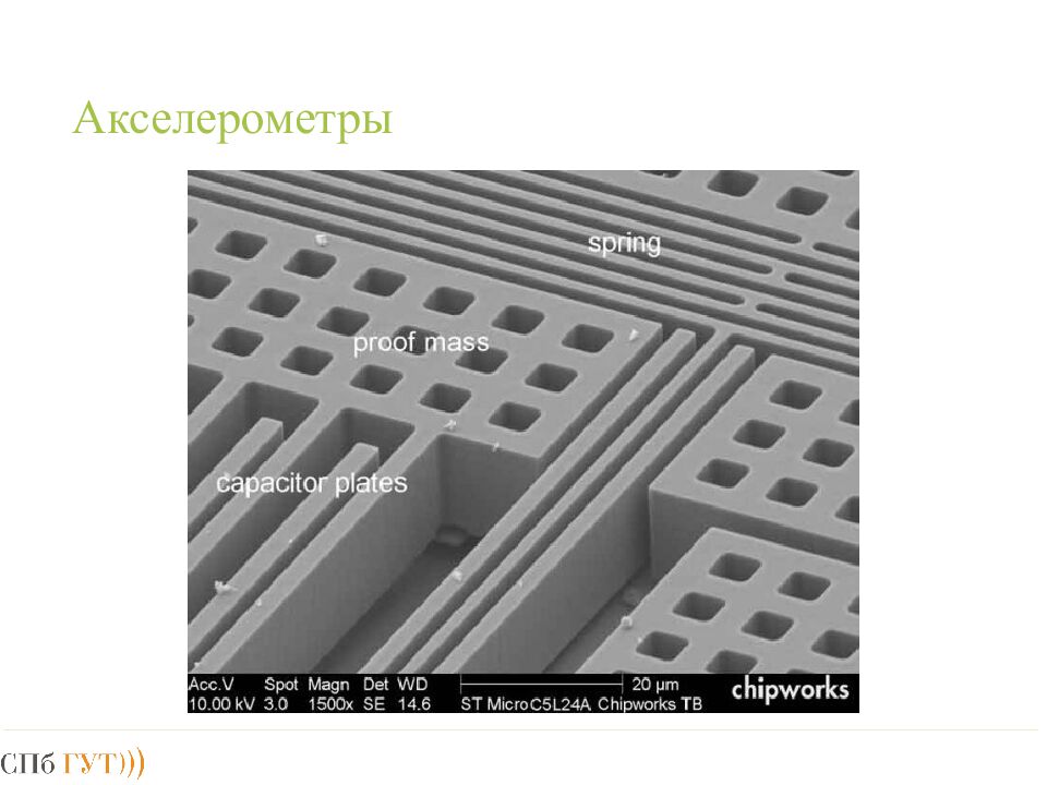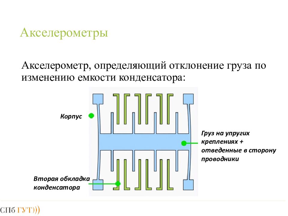 Акселерометр, определяющий отклонение груза по изменению емкости конденсатора: Груз на упругих креплениях + отведенные в сторону проводники Корпус Вторая обкладка конденсатора