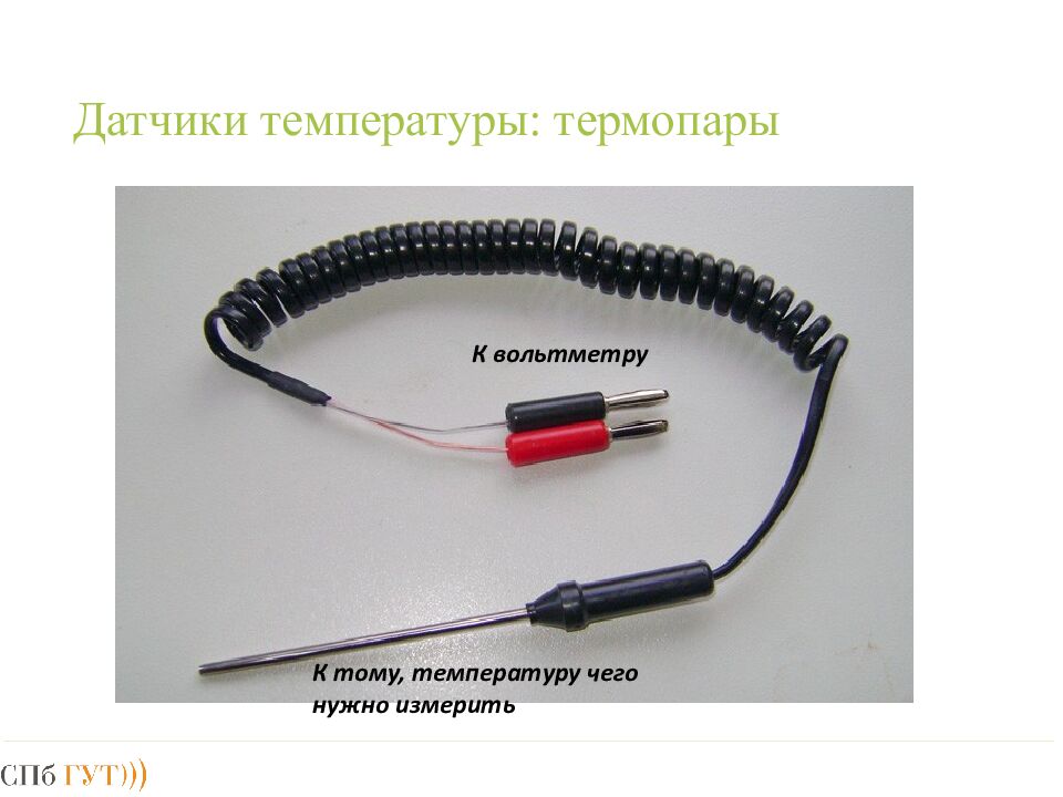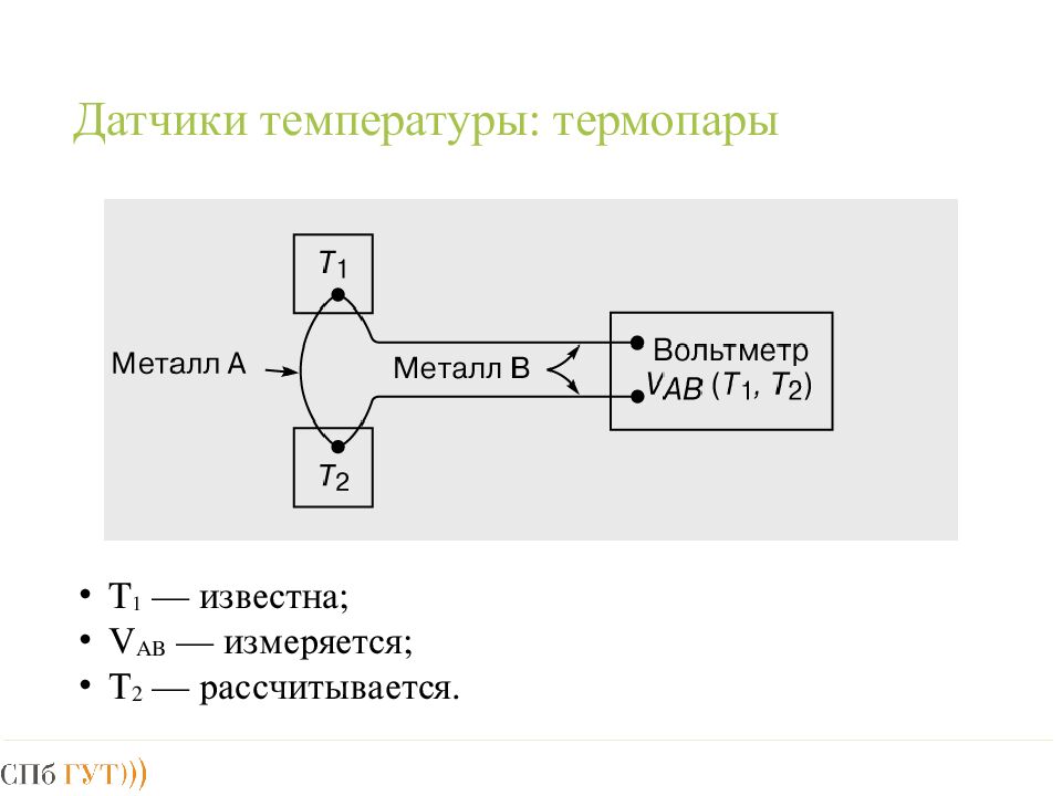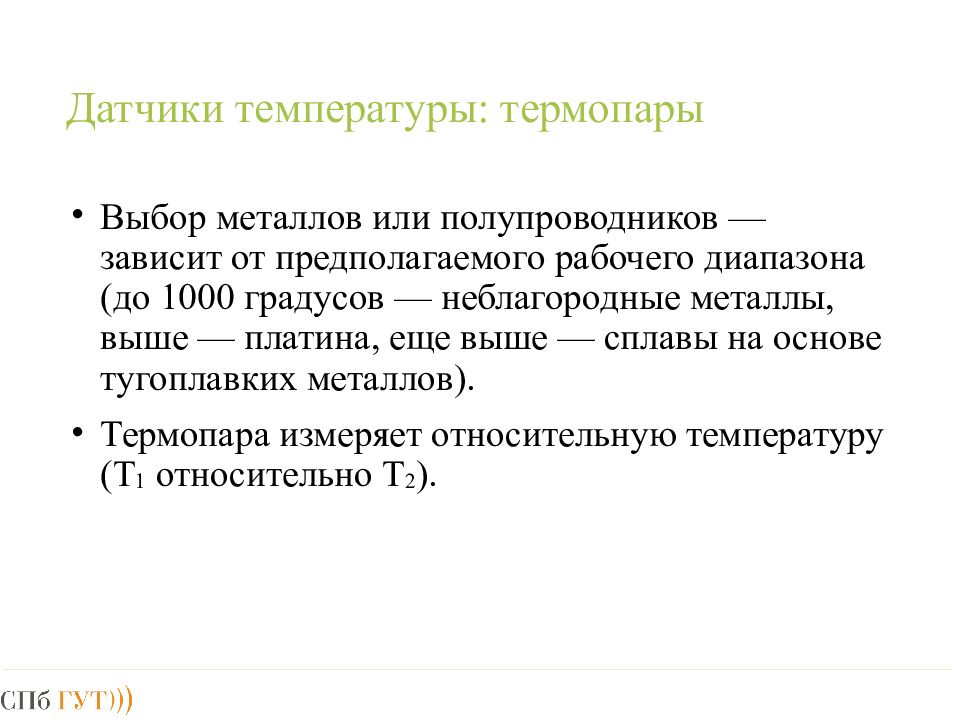 Выбор металлов или полупроводников — зависит от предполагаемого рабочего диапазона (до 1000 градусов — неблагородные металлы, выше — платина, еще выше — сплавы на основе тугоплавких металлов). Термопара измеряет относительную температуру (Т 1 относительно Т 2 ).
