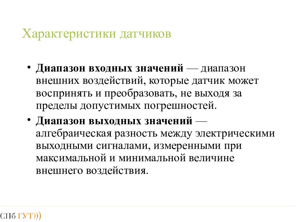 Диапазон входных значений — диапазон внешних воздействий, которые датчик может воспринять и преобразовать, не выходя за пределы допустимых погрешностей. Диапазон выходных значений — алгебраическая разность между электрическими выходными сигналами, измеренными при максимальной и минимальной величине внешнего воздействия.