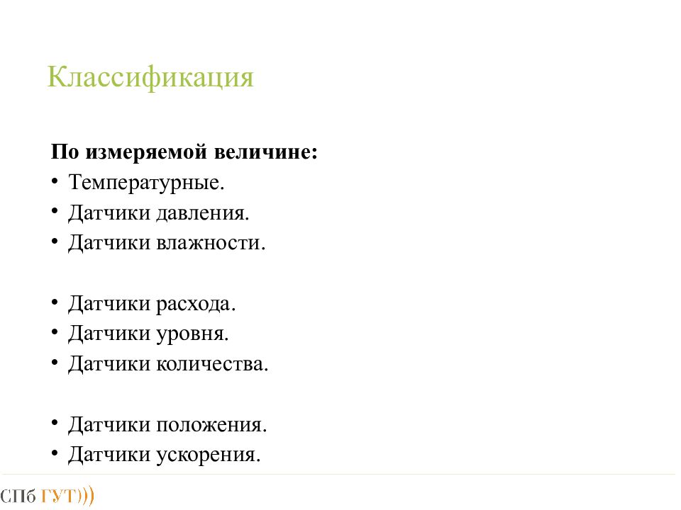 По измеряемой величине: Температурные. Датчики давления. Датчики влажности. Датчики расхода. Датчики уровня. Датчики количества. Датчики положения. Датчики ускорения.