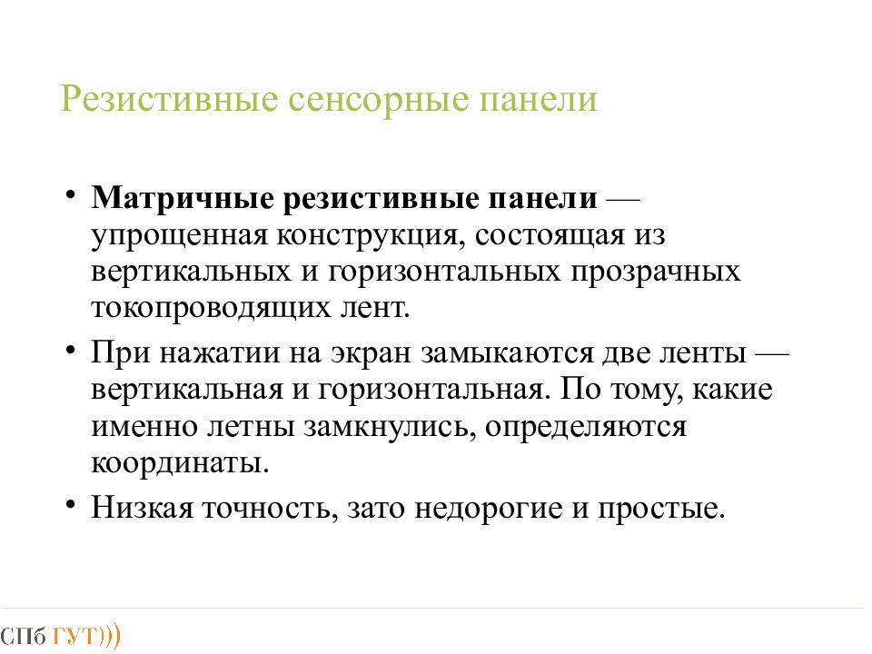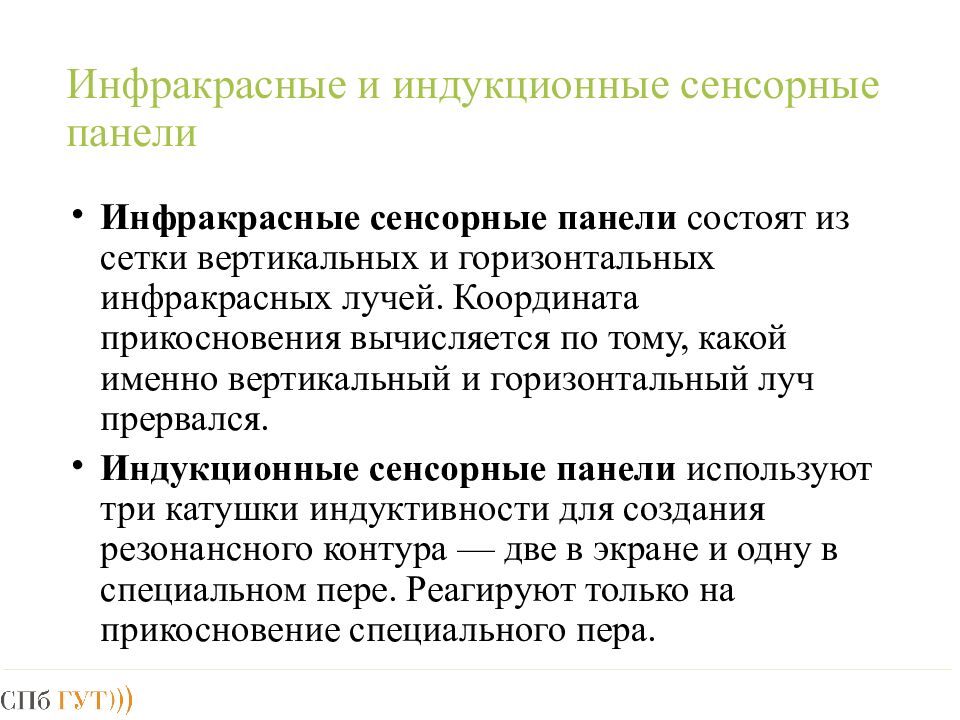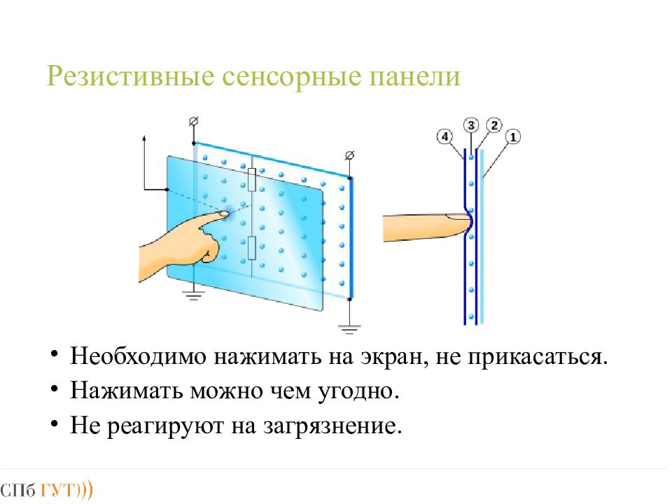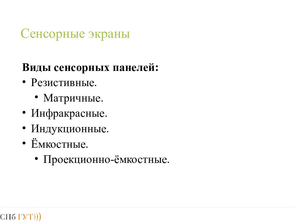 Виды сенсорных панелей: Резистивные. Матричные. Инфракрасные. Индукционные. Ёмкостные. Проекционно-ёмкостные.