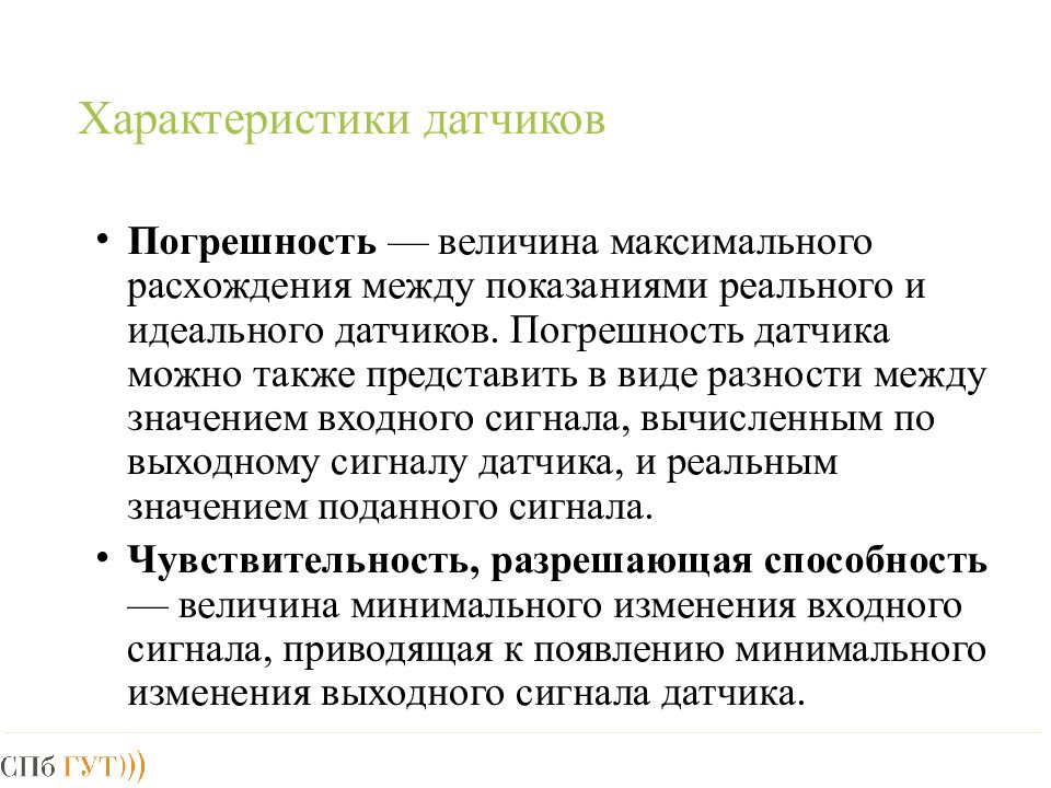 Погрешность — величина максимального расхождения между показаниями реального и идеального датчиков. Погрешность датчика можно также представить в виде разности между значением входного сигнала, вычисленным по выходному сигналу датчика, и реальным значением поданного сигнала. Чувствительность, разрешающая способность — величина минимального изменения входного сигнала, приводящая к появлению минимального изменения выходного сигнала датчика.