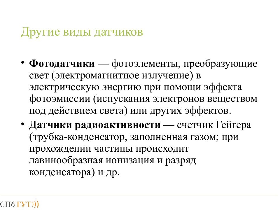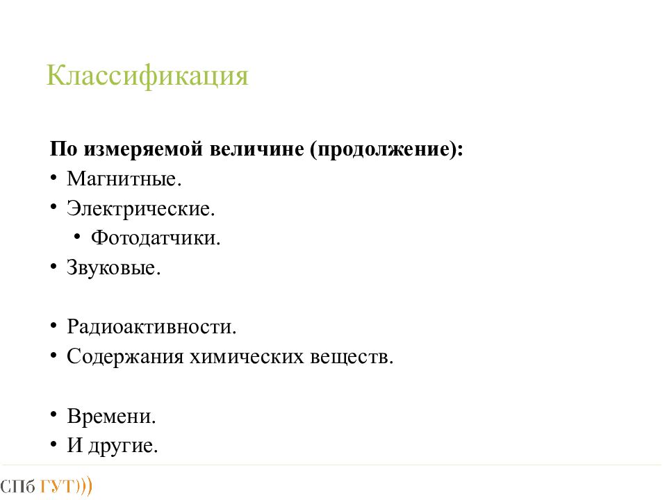 По измеряемой величине (продолжение): Магнитные. Электрические. Фотодатчики. Звуковые. Радиоактивности. Содержания химических веществ. Времени. И другие.