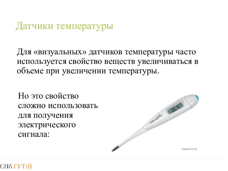 Для «визуальных» датчиков температуры часто используется свойство веществ увеличиваться в объеме при увеличении температуры. Но это свойство сложно использовать для получения электрического сигнала: