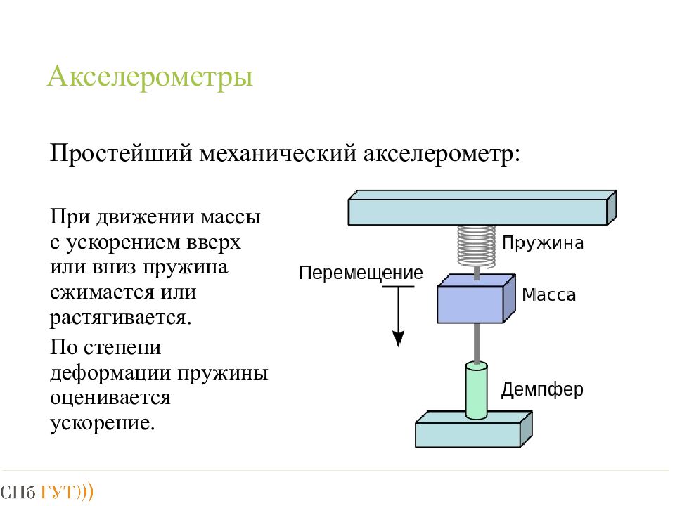 Простейший механический акселерометр: При движении массы с ускорением вверх или вниз пружина сжимается или растягивается. По степени деформации пружины оценивается ускорение.