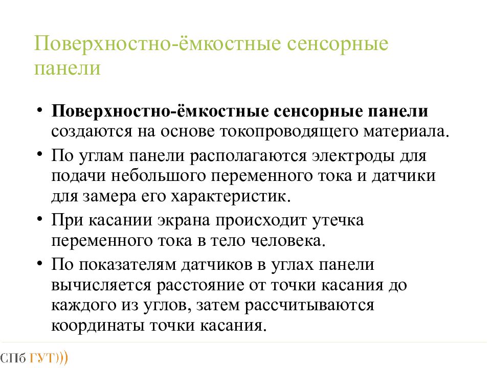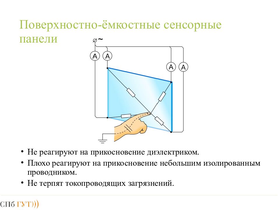 Поверхностно-ёмкостные сенсорные панели создаются на основе токопроводящего материала. По углам панели располагаются электроды для подачи небольшого переменного тока и датчики для замера его характеристик. При касании экрана происходит утечка переменного тока в тело человека. По показателям датчиков в углах панели вычисляется расстояние от точки касания до каждого из углов, затем рассчитываются координаты точки касания.
