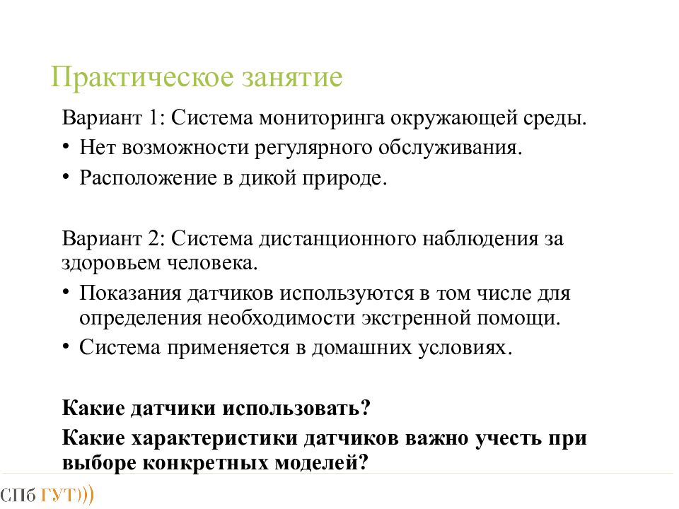 Вариант 1: Система мониторинга окружающей среды. Нет возможности регулярного обслуживания. Расположение в дикой природе. Вариант 2: Система дистанционного наблюдения за здоровьем человека. Показания датчиков используются в том числе для определения необходимости экстренной помощи. Система применяется в домашних условиях. Какие датчики использовать? Какие характеристики датчиков важно учесть при выборе конкретных моделей?