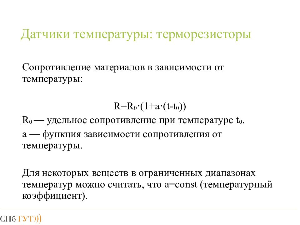 Сопротивление материалов в зависимости от температуры: R=R 0 ⋅(1+a⋅(t-t 0 )) R 0 — удельное сопротивление при температуре t 0. a — функция зависимости сопротивления от температуры. Для некоторых веществ в ограниченных диапазонах температур можно считать, что a=const (температурный коэффициент).