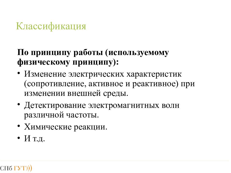 По принципу работы (используемому физическому принципу): Изменение электрических характеристик (сопротивление, активное и реактивное) при изменении внешней среды. Детектирование электромагнитных волн различной частоты. Химические реакции. И т.д.