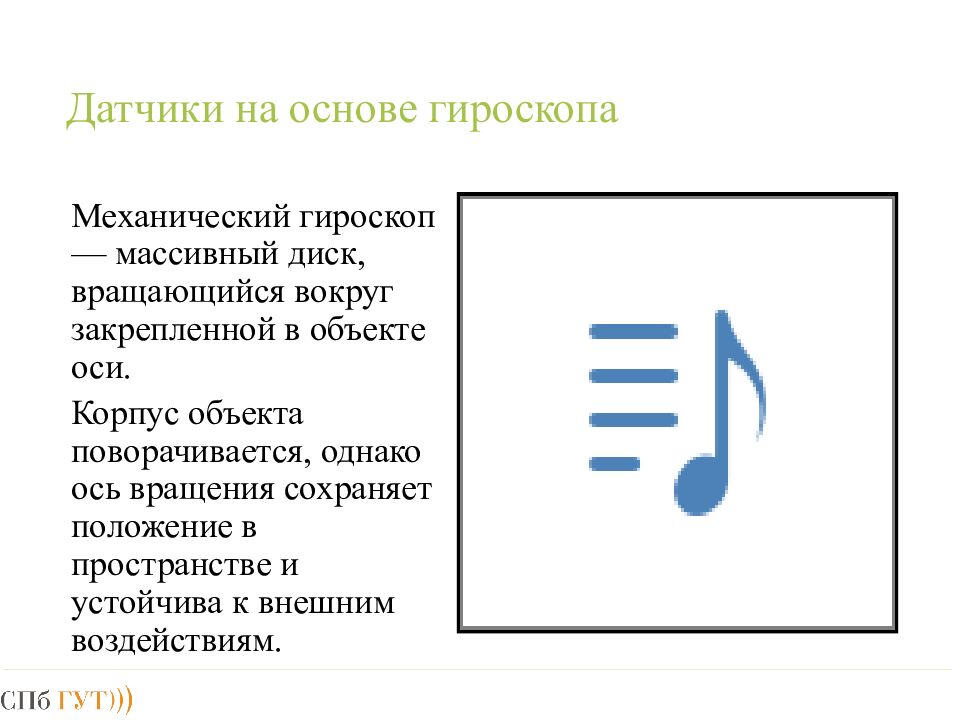 Механический гироскоп — массивный диск, вращающийся вокруг закрепленной в объекте оси. Корпус объекта поворачивается, однако ось вращения сохраняет положение в пространстве и устойчива к внешним воздействиям.