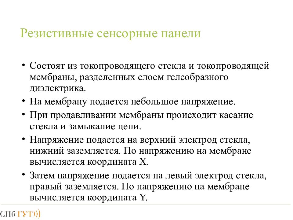 Состоят из токопроводящего стекла и токопроводящей мембраны, разделенных слоем гелеобразного диэлектрика. На мембрану подается небольшое напряжение. При продавливании мембраны происходит касание стекла и замыкание цепи. Напряжение подается на верхний электрод стекла, нижний заземляется. По напряжению на мембране вычисляется координата X. Затем напряжение подается на левый электрод стекла, правый заземляется. По напряжению на мембране вычисляется координата Y.