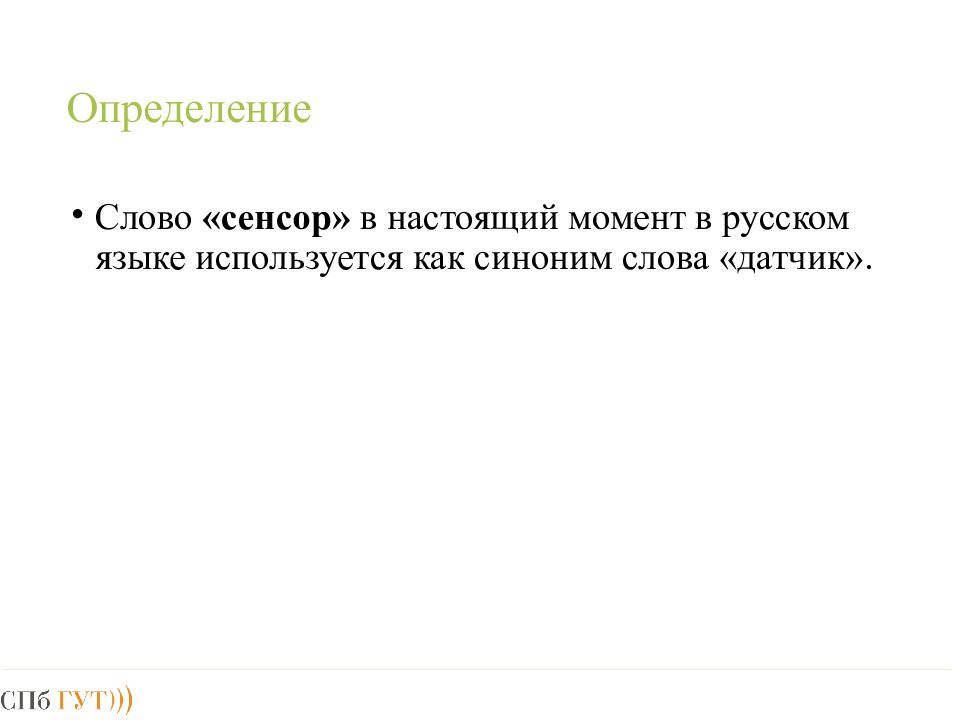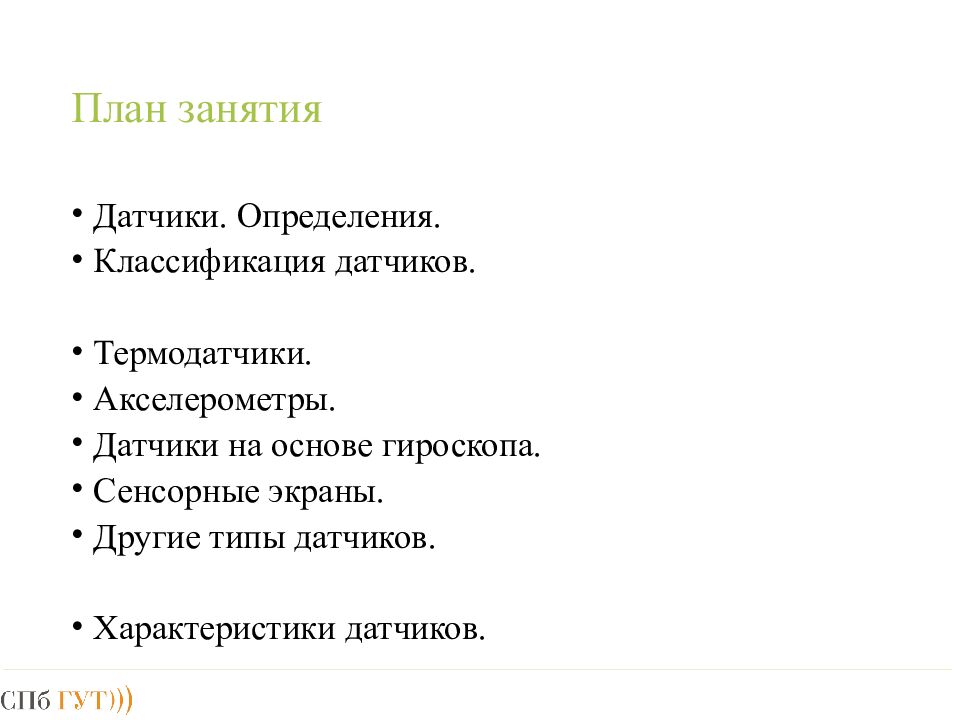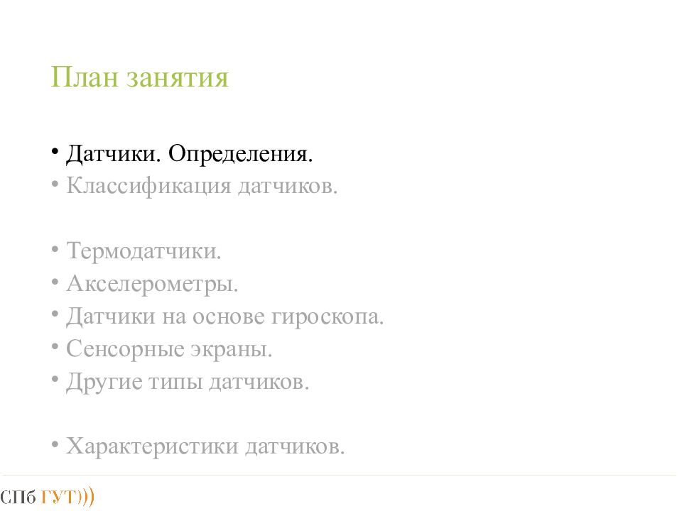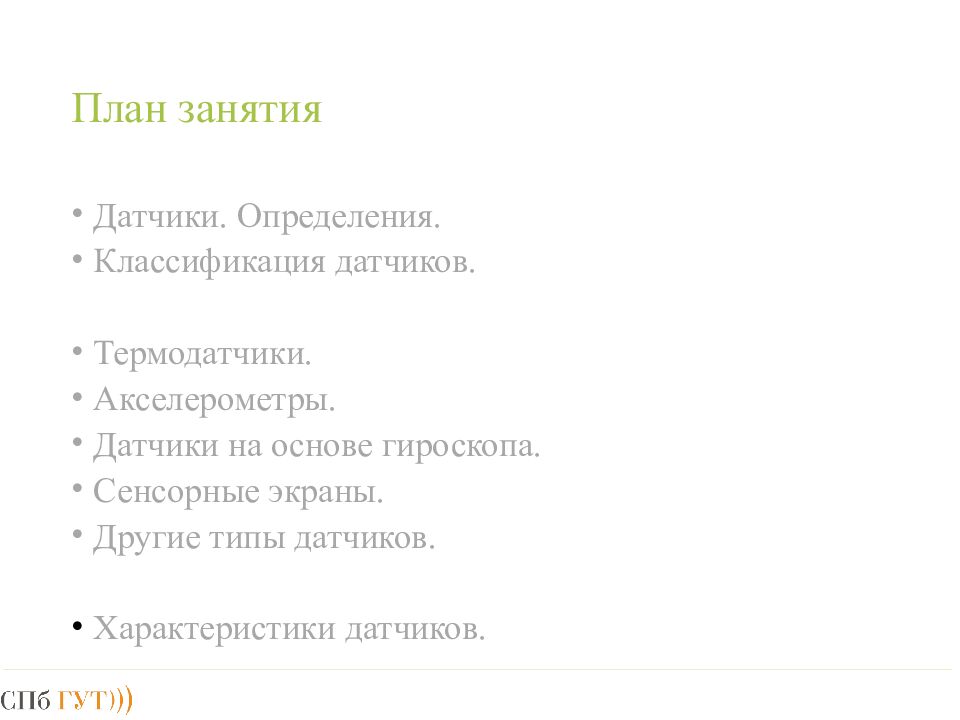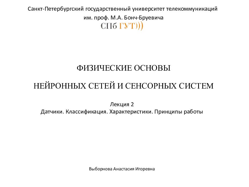 Физические основы Нейронных сетей и сенсорных систем Санкт-Петербургский государственный университет телекоммуникаций им. проф. М.А. Бонч-Бруевича Выборнова Анастасия Игоревна Лекция 2 Датчики. Классификация. Характеристики. Принципы работы