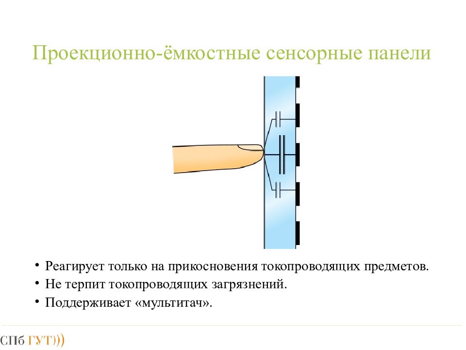 Реагирует только на прикосновения токопроводящих предметов. Не терпит токопроводящих загрязнений. Поддерживает «мультитач».