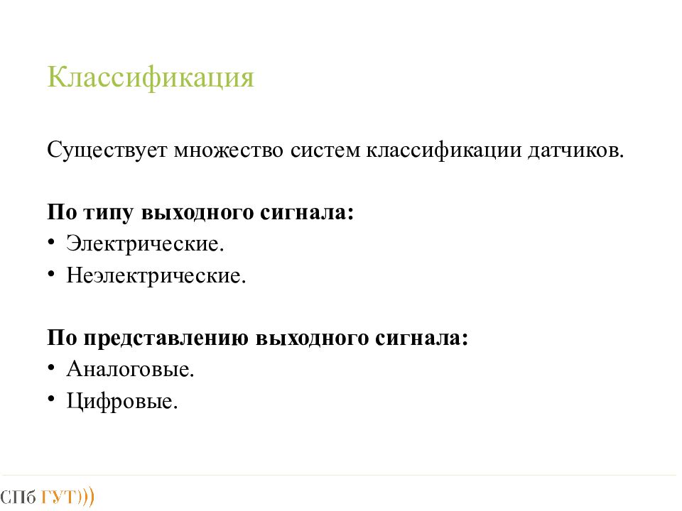 Существует множество систем классификации датчиков. По типу выходного сигнала: Электрические. Неэлектрические. По представлению выходного сигнала: Аналоговые. Цифровые.