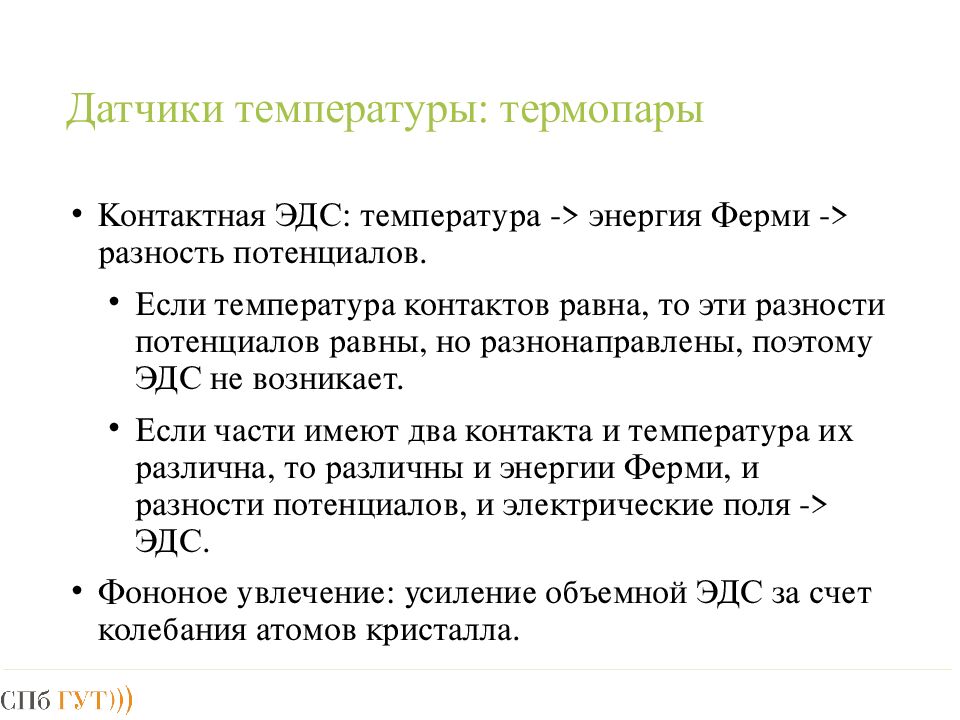 Контактная ЭДС: температура -> энергия Ферми -> разность потенциалов. Если температура контактов равна, то эти разности потенциалов равны, но разнонаправлены, поэтому ЭДС не возникает. Если части имеют два контакта и температура их различна, то различны и энергии Ферми, и разности потенциалов, и электрические поля -> ЭДС. Фононое увлечение: усиление объемной ЭДС за счет колебания атомов кристалла.